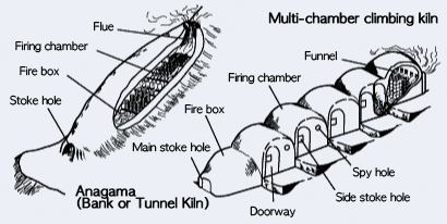 A tunnel kiln built on the hillside, which consists of a door to stoke the fuel and a fire box on the lower end, the firing chamber and a flue through which smoke is sent out. For greater efficiency, kilns with steeper slope or longer chambers are built. These kilns are called climbing kiln (noborigama) or dragon kiln (long kiln in Chinese). A more sophisticated variant of the climbing kiln is the multi-chambered climbing kiln that has many separate chambers.