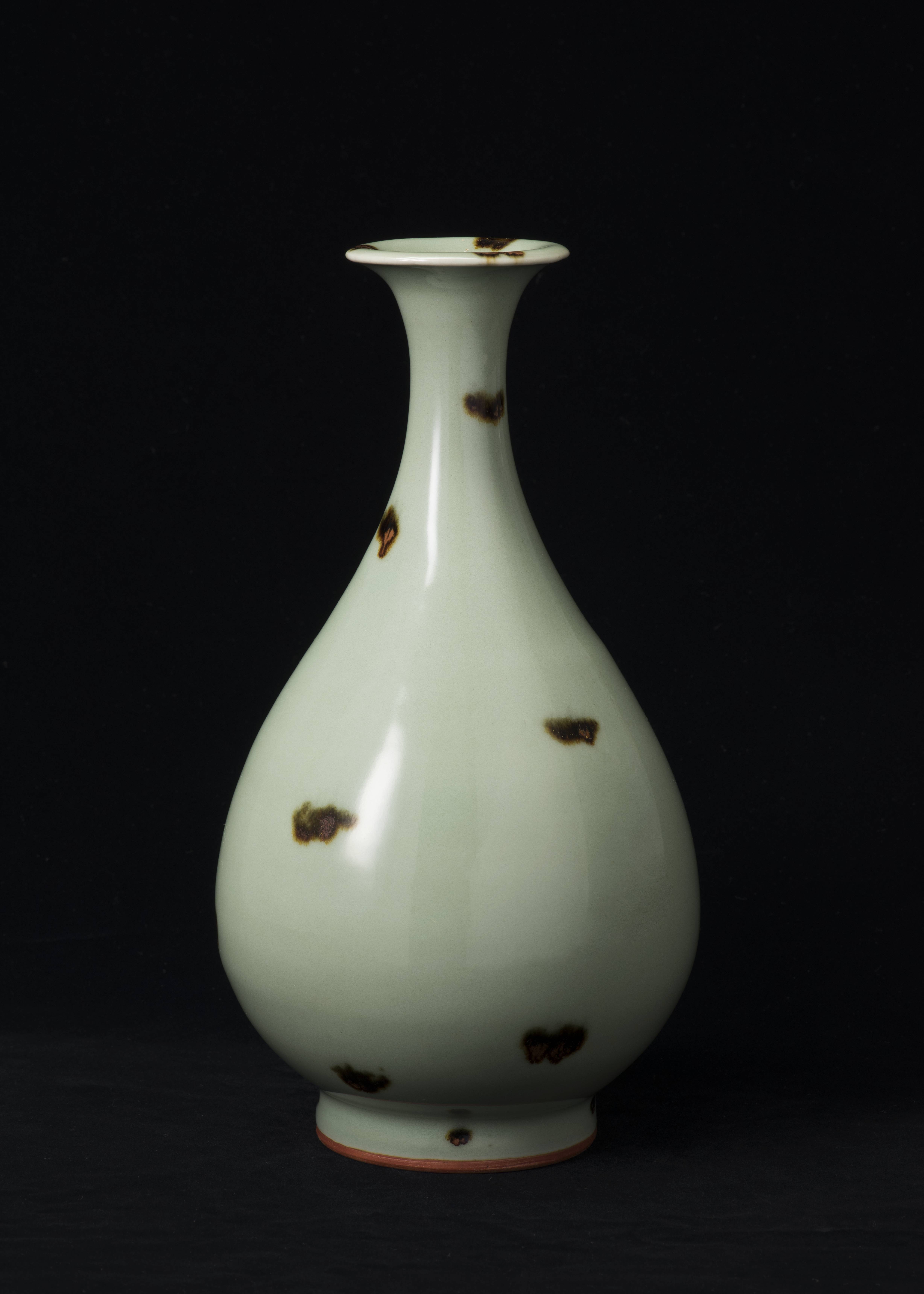 ユリの花のような口のつくり、生命感あふれる瓜のような胴、そしてドレープのある底部などエレガントな造形を見せる、高麗翡色青磁の花瓶。その美しさはモデルとなった中国景徳鎮窯の青白磁に勝るとも劣らない。