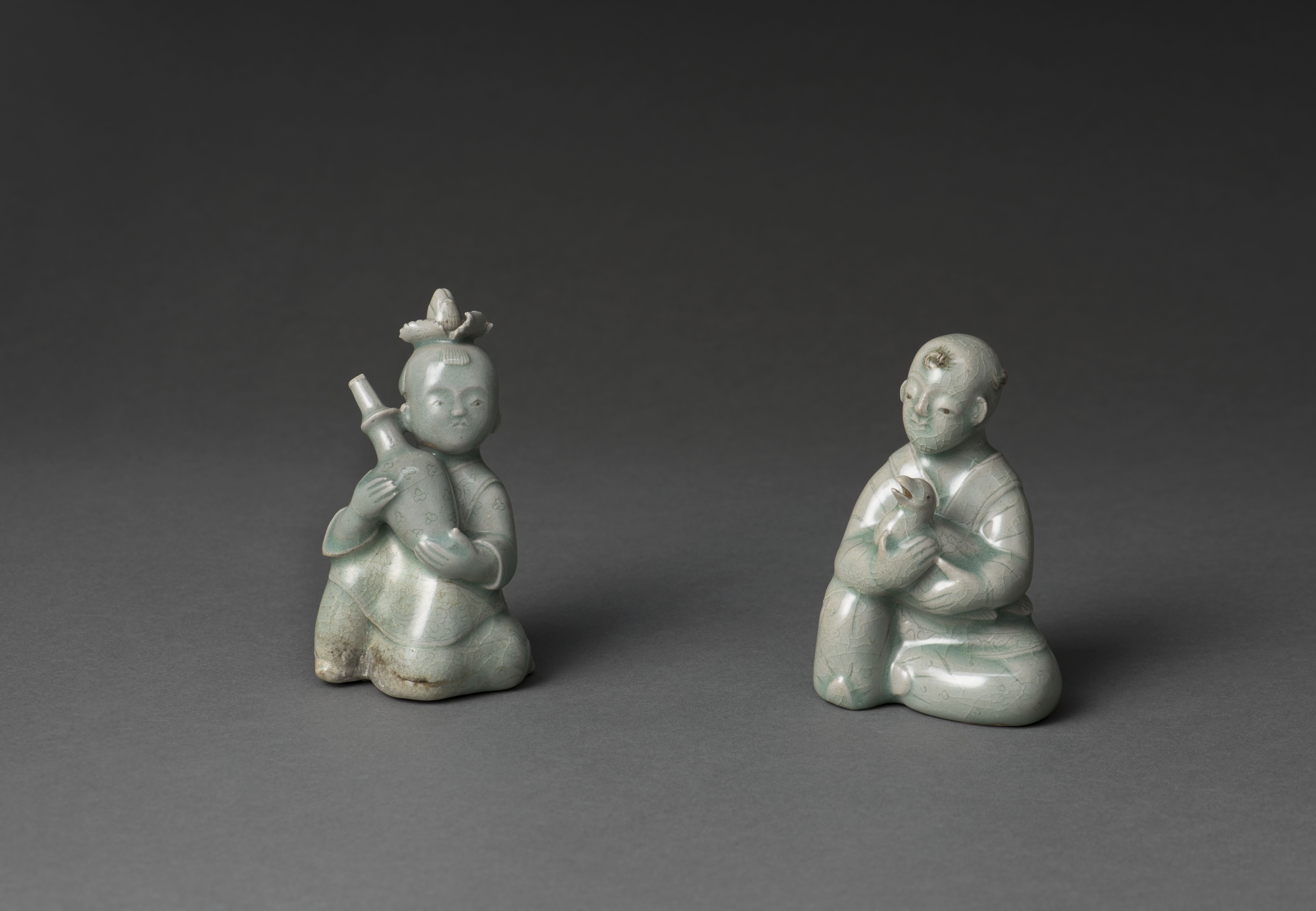 左は愛らしい童女が片膝を立てて坐し、両手で水瓶を抱える。頭飾りの蓮のつぼみを取りはずして水を入れ、水瓶が注ぎ口となる。右の童子は、底部の小さな穴から水を入れ、抱いた鴨の口から水を注ぐ。同じ時代・同じ場所で作られ、大阪で800年ぶりに再会した、高麗翡色の愛すべき水滴。