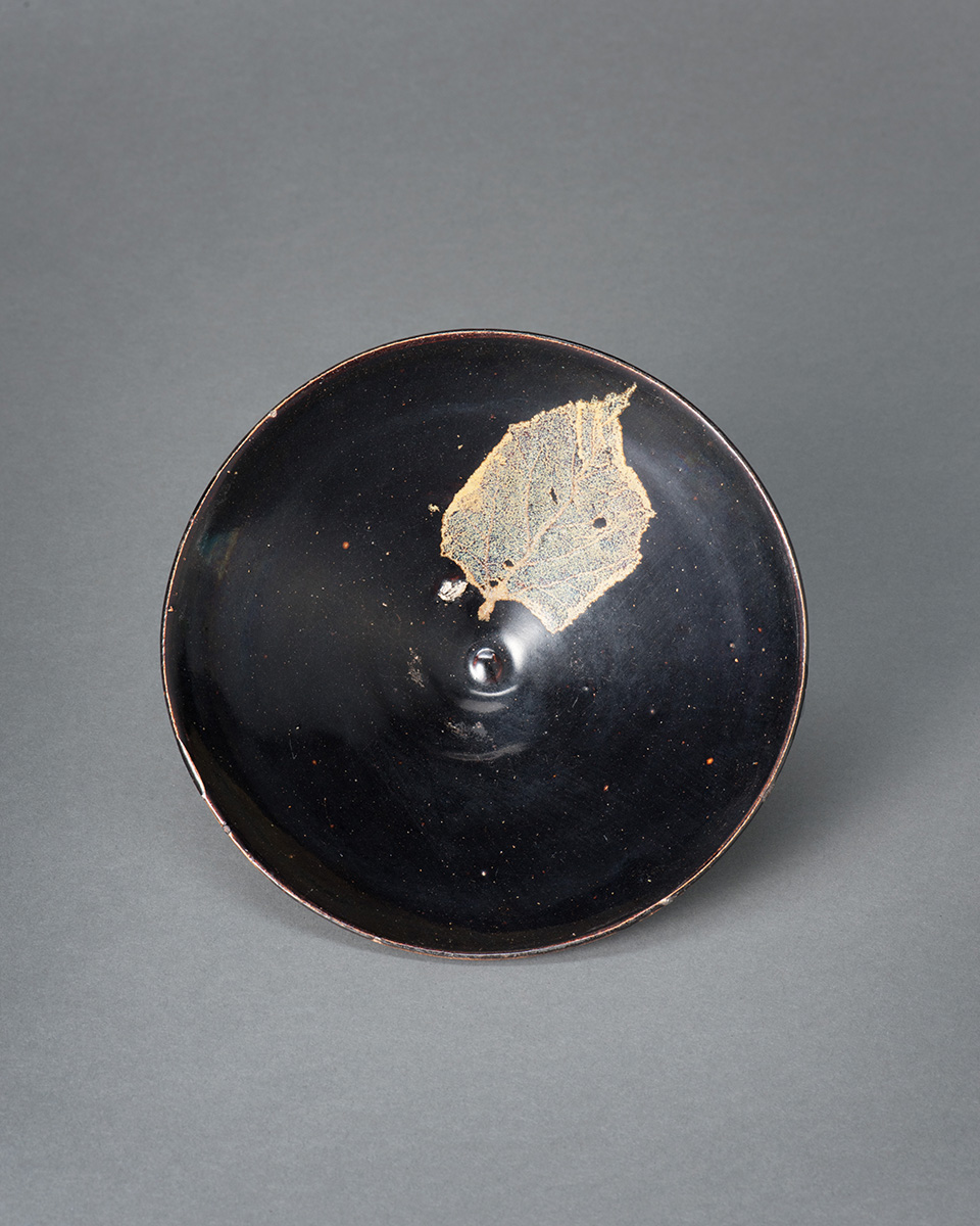 内面には本物の木葉が焼き付けられており、日本では「木葉天目」と呼ばれる。木葉は桑の枯葉が用いられ、桑の葉が禅に通じるという当時の詩の一句から、禅との関連がうかがえる。黒釉上には金彩の梅花文の痕跡も一部確認できる。加賀前田家伝来品。