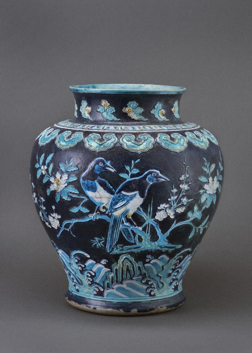 法花とは凸起状に盛り上げた輪郭線をつくり、藍・白・黄・緑・紫などの低火度鉛釉を塗り分け文様を立体的に表す技法である。胴の両面には花樹に止まるつがいの鳥が浮き彫り風に表されている。華やかな色合いと優美な文様が印象的な、法花として最大級の作例である。