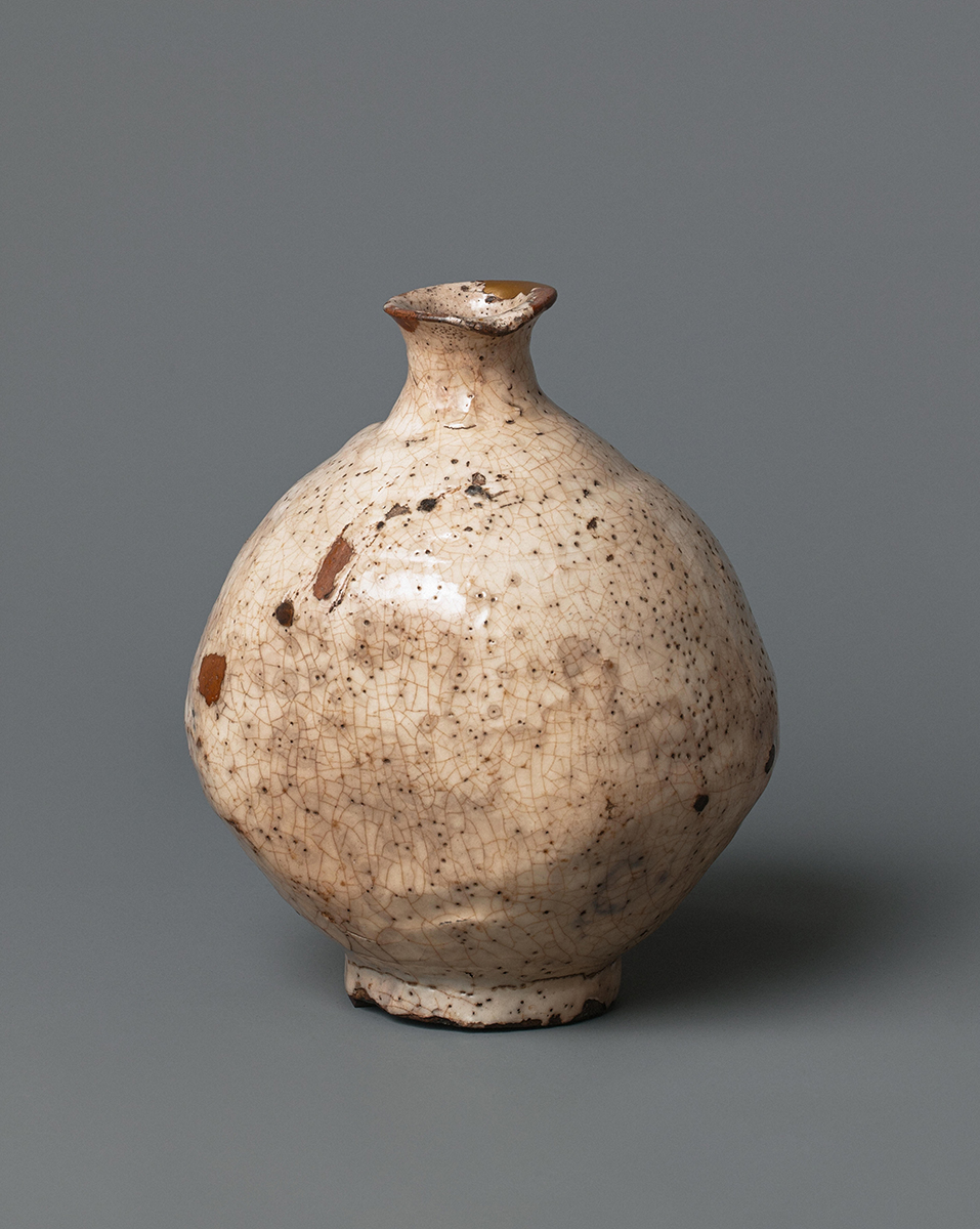 全面に白化粧を浸しがけした粉引技法だが、長年の使用で所々に生じた「染し み」は日本では「雨漏(あまもり)」とも呼ばれ、茶人の間で「景色」として珍重された。口のくびれは注ぎやすくするための工夫である。加賀・前田家伝来と伝えられ、粉青粉引瓶の最高傑作である。