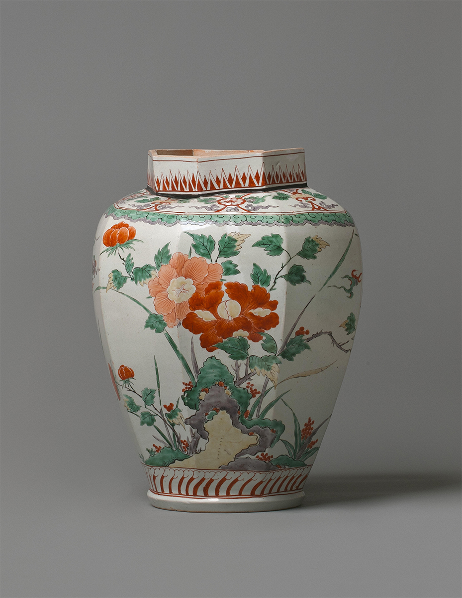 胴の両面には太湖石を配した牡丹と椿の図が、八角に面取された面を意識せず大らかに描かれている。文様や造形など延宝年間(1673-1681)の柿右衛門様式の製品にも通じる。輸出伊万里と呼ばれる海外向け輸出品で、長らくヨーロッパにあったと伝えられる。