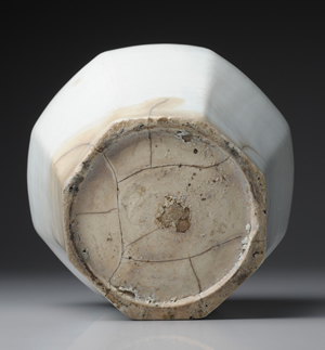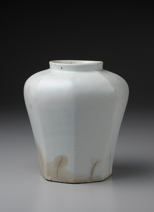 17세기의 회백색 백자는 18세기 전반이 되면 유백색의 유색을 띠기 시작합니다. 특히 면을 깎는 수법은 눈부시게 발달하여 면을 깎는 기법은 이 시대의 특징입니다. 낮은 입과 심하게 부푼 어깨 여덟면으로 깎아진 동체는 단정한 멋이 있으며, 18세기 전반의 도자 제작법의 전형을 보여주고 있습니다. 입부분의 내측에는 뚜껑받침이 있어 원래 뚜껑이 있었음을 보여줍니다. 경기도 광주 관요官窯 중 금사리 가마 계통의 가마에서 제작되었을 것으로 추정됩니다.