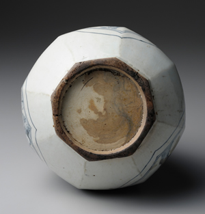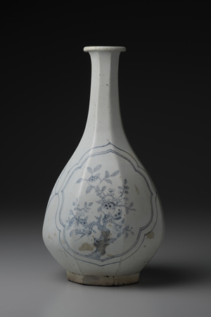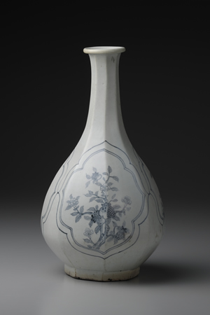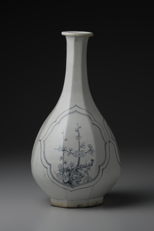 긴 목과 풍만하게 부풀에 있는 동체와의 비율이 잘 조화된 큰 병입니다. 목에서 굽에 걸쳐 여덟면으로 깎여져 있습니다. 동체의 세방향에 능화稜花 모양의 창틀을 만들어 그 안으로 각각 석류, 복숭아, 매화 나무가 묘사되어 있습니다. 모두 길상吉祥 문양으로 매화나무는 17세기경의 조선회화 화풍을 그대도 준수하였으며 발색도 짙어 화폭을 보는 듯한 멋이 있습니다.