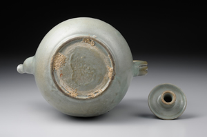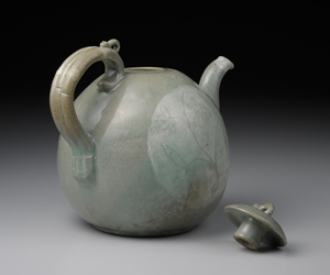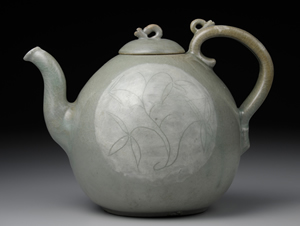본작품은 둥글고 풍만한 기형으로, 손잡이와 주구注口의 조형에 힘이 넘치는 작품입니다. 이 종류의 주자의 기원은 확실하지는 않습니다만, 중국에서는 보기 힘들며, 고려에서도 12세기에 집중되어 있습니다. 동체의 두가지 면에는 원형의 창을 백점토로 채워 그 안에 가는 음각선으로 가련한 초화문을 묘사하고 있습니다. 청자의 유약밑에 백점토로 문양을 넣는 기법을 퇴화라고 하며, 12세기부터 13세기에 전성기를 맞이합니다.
