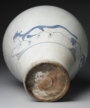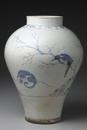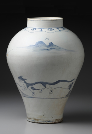 청화靑畵가 더욱더 전개된 것은 18세기 전반에 최후의 관요官窯인 분원리分院里(1752-1883)에 정착해서 부터입니다. 그 후 얼마동안은 이러한 여백이 충분한 화폭과 같은 문양을 선호하였습니다. 높게 직립한 입과 어깨에는 분원리 가마 특유의 여의두문如意頭文띠를 넣었습니다. 동체 하부에 경계선을 두르고, 원경遠景에는 우뚝 솟아 있는 산맥, 근경近景에는 바위 위를 배회하는 고양이 같은 호랑이를 그려넣었습니다. 뒷면에는 둥글게 웅크리고 있는 호랑이가 고목에 앉아 있는 까치를 올려보고 있습니다. 호랑이는 실제로 한반도에 서식하며, 영물로 신앙하여 숭배되었습니다. 좋은 소식을 알리는 까치와 함계 묘사되어 더욱 길상吉祥성을 높였다고 할 수 있습니다. 호랑이와 까치를 조합한 「작호도鵲虎圖」는 18세기의 화원에 의한 화폭에서 민화까지 널리 선호된 화제畵題이기도 합니다.