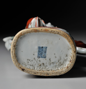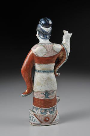 器型乍見如右手與右腳高舉作舞蹈姿態的女子塑像,實際上為一水注。頭頂的髮髻為蓋,右袖口為注口,左手腕則為把手。服裝紋樣以釉上彩顏料進行彩繪,紅地與白瓷部分施加金彩。金彩裝飾保存良好,全作予人華麗的印象。圈足內以青花書「富貴佳器」銘。倫敦大衛德基金會( Percival David Foundation of Chinese Art)亦有類似收藏。