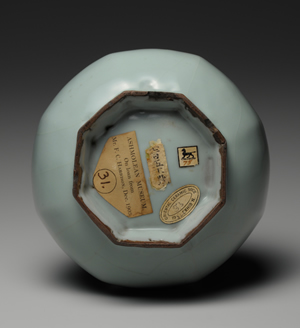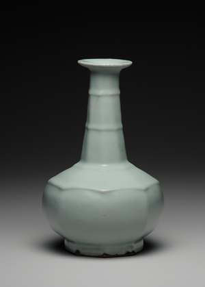 瓶下腹鼓張,盤口外撇呈寬折唇狀,器身作八稜式。可能為模仿古銅器的弦紋,於器頸與肩部飾突起線紋。全器厚施乳濁淡青色調的粉青釉。此器胎土為灰黑色,圈足接地處露胎,即所謂「鐵足」,為南宋官窯的特色之一。在被認為是南宋修內司官窯的杭州老虎洞窯址以及杭州烏龜山的郊壇下官窯窯址亦曾出土類似之弦紋瓶,但在釉色與作風上略有差異。即便如此,此作釉色優美、造型端正,兼有「薄胎厚釉」等特色,可以說是具備南宋官窯特徵的作品。