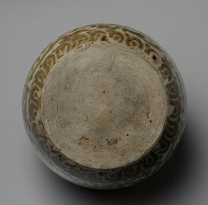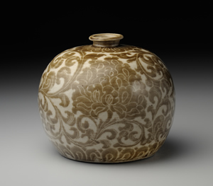 此作器口窄小,器身猶如切去了下半部的梅瓶,僅留器身上半,器型俗稱為「太白尊」,或名「吐魯瓶」。於白瓷胎土上施掛鐵泥,再以剔花技法剔除紋樣周圍地紋,產生褐色的纏枝牡丹花紋浮現於白瓷肌理上的對比效果。此作乃將磁州窯的裝飾技法,應用在定窯白瓷之中,為定窯中的珍稀之作。中國國家博物館也有採類似技法製作的白地剔花枕,底部墨書「皇統元年(1141),推測這樣的技法可能發展於金代時期。