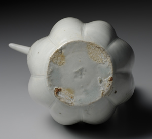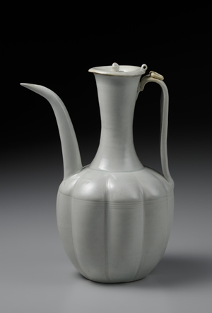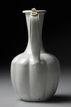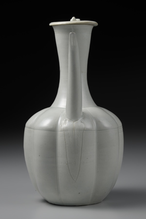 青白瓷,也稱「影青」,乃是在白瓷胎體上施掛帶青色調透明釉的一類製品。宋代,以江西景德鎮為主,浙江、福建等其他地區也大量燒製青白瓷,除供應國內所需,亦遠銷海外。在元代景德鎮真正燒造白瓷之前,青白瓷可以說是從青瓷到白瓷發展過程中的一個過渡性製品。本作在瓜稜形的器身上,附上線條俐落,造型優雅的流口與把手,整體器型模仿自金屬器,據傳出土於朝鮮半島。