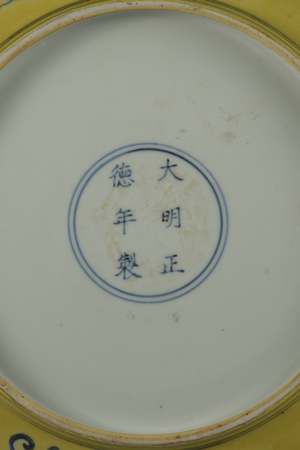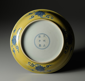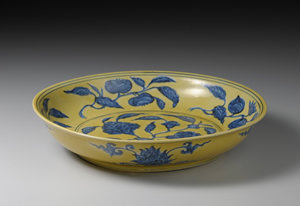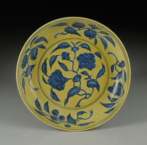 本器乃於燒製完成的青花盤上,於白地部分再施加黃釉,二次入窯以低溫燒製而成。濃烈的黃釉與鮮豔的藍花,兩相輝映形成視覺對比。此種技法始於宣德年間,其後各個時期均有製作。盤心描繪折枝石榴,內壁裝飾柿、櫻桃、荔枝、桃等具吉祥意義的果實,外壁則描繪寶相花紋樣。此類紋樣在宣德年間以後,反覆出現於青花、琉璃釉、柿釉等各類製品之中。