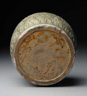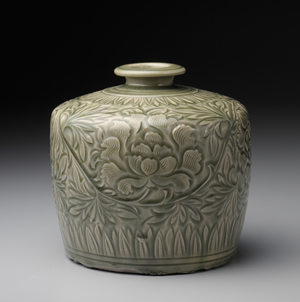 位於陝西省銅川市的耀州窯,曾盛行燒造呈橄欖青釉色的優質青瓷。全器裝飾俐落流暢的刻花紋樣,為這時期製品的特徵之ㄧ。本作自器肩至器身,刻繪花型碩大的纏枝牡丹紋樣,主紋樣上下,各環繞一圈具有特色的二重蓮瓣紋。雕刻紋樣時,入刀深刻銳利,切削處厚積青釉,於紋樣周圍形成美麗陰影,本作為北宋時代耀州窯青瓷的代表名品,舉世知名。
