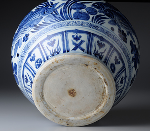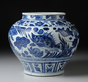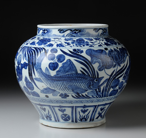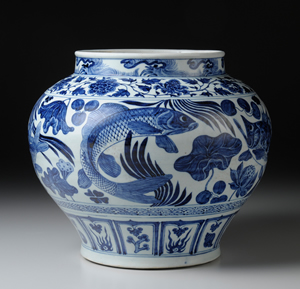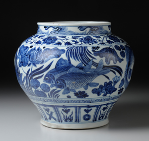 此作器型出現於元代,這種大罐同時也應用於青白瓷、釉裡紅與青瓷等製作上。本來帶蓋,為用以盛裝酒水等液體的容器,在日本俗稱為「酒會壺(shukaiko)」。本器在器身中央描繪於蓮池中悠遊的鱖魚和草魚。魚藻紋是元代陶瓷器上經常可見的裝飾紋樣,亦是江南地區民間繪畫的流行題材。魚在中文中,與「餘」諧音,乃象徵財富有餘的吉祥紋飾。因魚多產繁殖力旺盛,故又寓意子孫繁盛。此器不論從紋樣或鈷料發色等各方面來看,都可說是元青花的代表作之一。