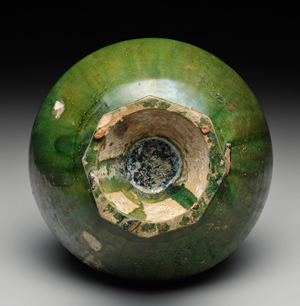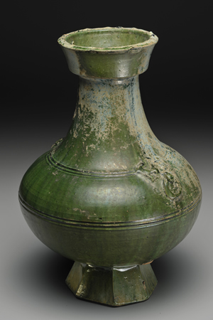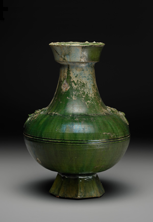 發色鮮艷的綠釉,乃是以銅作為呈色劑的低溫鉛釉,頻繁用於東漢時期隨葬用的明器之上。此壺原型可溯自青銅器中的「鍾」,從器身裝飾的獸面鋪首及弦紋,仍可辨識出來自青銅器的影響。此外,亦以優美的釉色與質感,在色調上模仿青銅。可見頻頻以隨葬品姿態出現的綠釉器,實為青銅器的替代品。此壺曾為川端康成所藏。