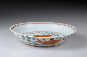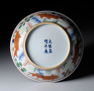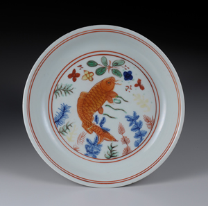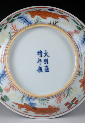嘉靖時期官窯以其色彩豐富著稱。盤中央的錦鯉於釉上黃彩之上進一步施塗紅彩,釉色因此呈現橘色,此為嘉靖官窯獨有的技法。典故出自「鯉魚躍龍門」之吉祥紋樣,在當時廣受歡迎。擺動身軀悠遊於水藻間的鯉魚,靈動富有生氣。盤外壁也描繪類似母題。圈足內以青花書「大明嘉靖年製」銘款。此作雖為小品,但卻可謂是凝聚了嘉靖官窯五彩作品魅力的一件佳作。