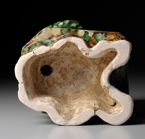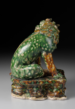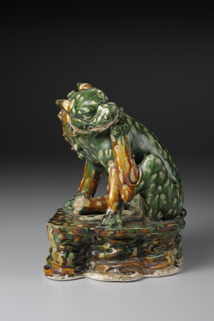 蹲踞岩座上的獅子,呈現舔咬左足的姿態。陝西省西安王家墳90號唐墓及臨潼唐慶山寺舍利塔塔基磚室(741年)亦成對出土類似的獅子。由此研判,這件獅子最早可能本有一對。塔基出土例亦說明了唐三彩不只作為墓室的隨葬品,亦用於佛教寺院之中。此作以優異的造型功力巧妙捕捉了獅子生動的表情與姿態。另外,全器多處用到三彩作品中常見的白斑技法裝飾,亦為其特色。