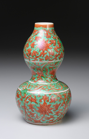 此器是反映明代彩瓷多樣性的一例佳作。於白瓷燒成後,以紅彩描繪纏枝寶相花紋,白地部分則於塗施綠釉後,入窯再次燒造。本作的紅彩部分,因繪製於白瓷底釉上,較「黄地青花紅彩纏枝牡丹紋葫蘆瓶」(編號No.00805)一作中的牡丹花紋,發色顯得沉著而內斂。因嘉靖皇帝崇信道教,葫蘆瓶器型的製品也於此時大量出現,