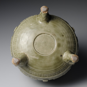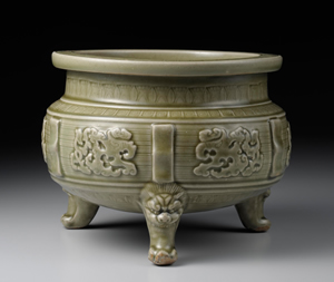 金代的耀州窯青瓷中,出現一類被稱為「月白釉」的嶄新釉色;與此同時,青瓷發色也出現轉變,出現不少帶黃綠色調釉色的製品。本作為大型香爐,器身三面以貼花技法,交互裝飾鳳紋和長方形的凸稜。三足作成獸面形式,為此器增添沈穩感受,堪稱金代耀州窯的傑作之一。陝西省藍田縣曾出土與本作相類之月白釉雙耳香爐,兩作尺寸相仿。