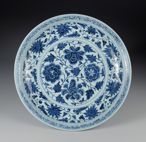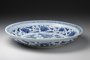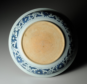 本作為大尺寸青花盤,盤心描繪主紋-牡丹紋,從正面、側面、背面等各個角度生動呈現牡丹的各種樣態,十分珍貴。牡丹的花瓣和葉脈均施以陰刻,凹陷處鈷料聚積,形成深沈色調,為紋樣帶來陰影變化。盤內壁與盤沿各裝飾一周寶相花纏枝紋及卷草紋,裝飾風格應受到伊斯蘭文化圈金屬器的影響。而伊斯蘭文化圈也是當時元青花的外銷地點之一。