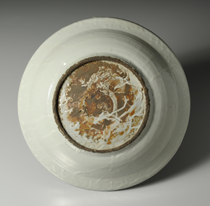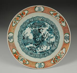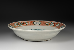 此類五彩瓷器,在日本稱為「吳須赤繪(gosu-akae)」,歐美則稱為「汕頭瓷器(Swatow ware)」,於日本和東南亞都有不少出土品與傳世品。製品特徵包括,灰色胎土,施掛之白釉色調柔和,器底經常沾黏許多砂粒等。1994年,於福建省平和縣漳州地區發現窯址後,即以「漳州窯」為名。裝飾多用民窯瓷器中的吉祥紋樣,本作於盤心描繪身背竹簍,身旁伴鹿的仙人形象,可能為八仙之一的韓湘子。此外,口沿處上下左右四個方位,則分別寫上「玉堂佳器」之吉祥文字。