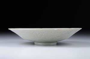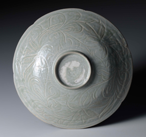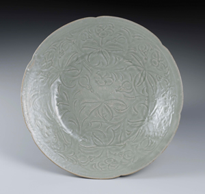 此盤器壁極薄,盤身呈折腰形式,口緣做六瓣花口狀。除盤面和高台外,外側全以刻花方式刻繪纏枝花紋。由於慈溪市龍口窯址也曾出土相類器物,可以確定此作應屬南宋初期的越窯製品。杭州市和紹興市曾經發現與此作相類的青瓷圈足破片,其內刻銘「御廚」,應是作為南宋宮廷食器之用。寺龍口窯址的南宋初期製品中,有一類屬於官窯類型,推斷此窯曾受命於宮廷,燒製宮廷用祭器與器皿。
