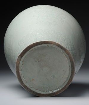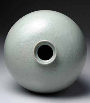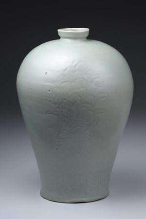 梅瓶為小口、豐肩,器腹漸次收斂的一種器型。瓶身線條呈S型曲線,足部略向外撇。沈穩安定的造型,已然跳脫中國影響,發展出高麗自身的風格特色。肩部飾雲紋,脛部裝飾一圈蓮瓣紋。主紋為蜀葵紋和蓮瓣紋,兼用刻花與線刻技法刻繪,作風纖細精緻。一直以來,梅瓶都被當作盛裝酒水的貯藏用器,但根據近來水下考古的調查發現,梅瓶亦有保管和搬運蜂蜜與芝麻油的用途。全羅南道康津郡沙堂里窯址等曾發現同類型之陶片。