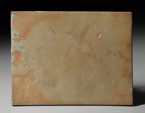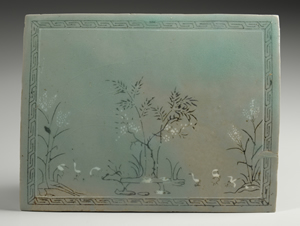 厚度約5釐米的薄型陶板。類似建築材料中的陶瓷磚,然其實際用途目前仍然不明。目前世上僅有幾件完整陶板,但未有一件能達此作之尺寸及具有繪畫性的裝飾紋樣。本作描繪蘆葦與竹子生長繁茂的水邊,數隻像鶴一般的鳥兒,悠遊漫步其中。鶴之形象,咸認取自中國「六鶴圖」中鶴的姿態。紋樣則利用象嵌技法裝飾,將白土和紅土填入雕去紋樣的凹陷處,使其在燒製後呈現白黑發色。此作在高麗象嵌青瓷中,散發特別濃厚的高麗美感。扶安柳川里窯曾生產不少陶板,此外高麗都城開城的宮城遺跡中亦曾出土陶板,由此可見這類作品當是實用器具。