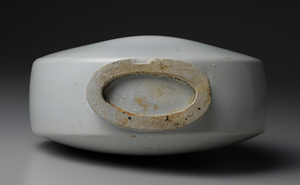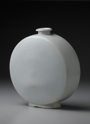 扁壺是指器身扁平之壺。成形方式,有將壺身前後拍壓成扁平形式,或是將兩片盤狀部件加以貼合,再附加器口及圈足之方式,本作採用後者。統一新羅時期已然出現陶製扁壺,主要作酒瓶與水瓶使用。此作器型端正,器身邊緣轉折處角度方正銳利,然器身下部略有歪斜,反而使造型顯得沈穩從容。京畿道廣州郡道馬里窯址所發現之15世紀末至16世紀初的出土品及其他16世紀的作品中,像本作一樣頸部與圈足低矮的例子不少。而17世紀的扁壺,器頸與圈足高度較高,與此作不同,推測此作應為16世紀官窯系統的製品。