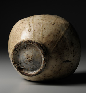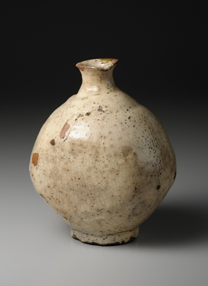 器口部分略作捏折變形,以利傾注液體。瓶身兩面略呈凹陷,便於拿取把持。此器使用粉青粉引技法,於全器表面遍施白化妝土,在長年使用下有多處產生浸染,此痕跡在日本稱為「雨漏(amamori)」,特別受到茶人珍愛。此外,在白色化妝土施塗缺漏處,以金或漆進行修補,所留下的痕跡亦頗具風情韻味。這些特色或許吸引了崇尚「侘び心(wabi-gokoro)」(譯注:日人的審美觀,欣賞殘缺質樸之美)的茶人,據說此瓶曾於茶會前招待賓客的料理宴席中,作為酒瓶供賓客宴飲使用。此瓶曾為加賀前田家族所有,傳世至今,堪稱粉青粉引瓶中的傑作之一。