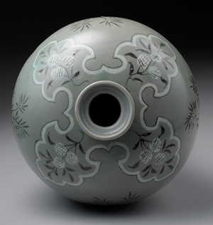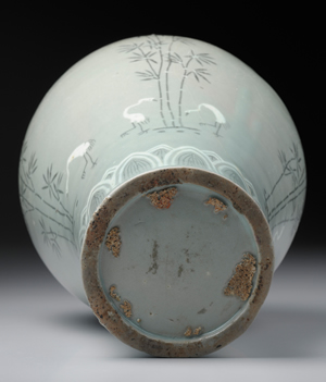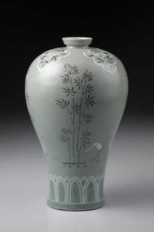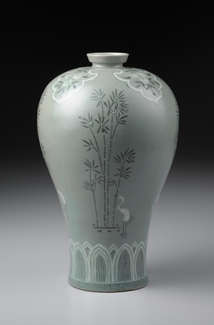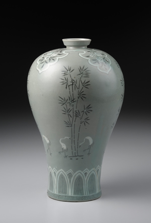 豐肩、肩部以下漸次收斂,至器足處又微向外撇,整體呈現S形曲線等,為高麗化器形的特徵之一。肩部裝飾四個內繪荔枝紋的袱紗紋樣;器足部分,各飾一道蓮瓣紋和雷紋。瓶身四面描畫竹鶴紋,兼具敘事性與繪畫性的紋樣,呈現極佳的裝飾效果。紋樣運用象嵌技法,先在胎體上雕刻圖案,再填入白土與紅土,其於燒製後轉成白黑兩色。深灰青綠色的釉色與紋樣,呈現規整端麗的風格,為高麗青瓷之佳作。