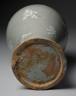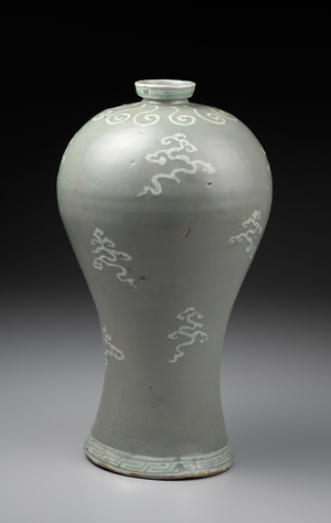 高麗時期的梅瓶,集中出現於高麗中期以後。此作豐肩,肩部下漸次收斂至脛部處外撇,器身線條呈現S形曲線之高麗梅瓶特徵。器面乍看似是運用象嵌技法,然而實際上乃採用白堆技法,於青瓷釉下以白色顏料堆塑紋飾,以此表現蓮瓣紋與雲紋。雲朵悠然漂浮於器表,青瓷釉色宛若幽玄青空。除此器外,目前未見以白堆技法裝飾的其他作品。