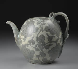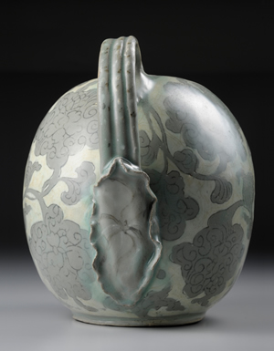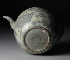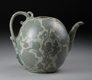 本作器身渾圓、全面使用象嵌技法裝飾,為高麗象嵌青瓷水注中之佳作,目前所知僅此一例。器身一面裝飾攀著藤蔓往上爬的童子,周邊則滿飾盛開的寶相花紋飾,是寄寓著子孫繁盛願望的紋樣。紋樣的輪廓以黑象嵌表現,背景部分,再使用填入白土的逆象嵌技法,使紋樣加倍醒目。此器作為同類作品中之最高傑作,被指定為重要文化財作品。裝飾採用多種技法,如在把手與流口根部,利用白堆及褐彩裝飾蓮葉與幼芽。