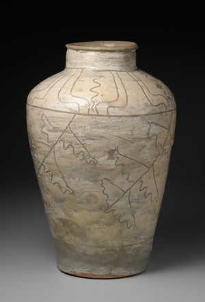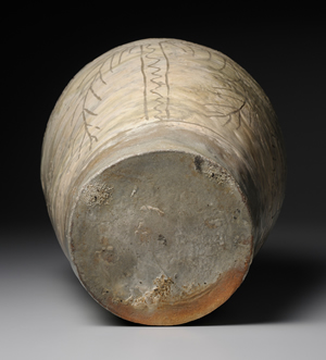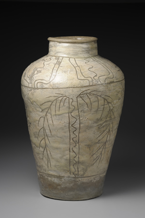 此作直口短頸,肩部至器足呈直線收斂。粉青器中雖常見此類器型,但尺寸大如此作者,尚屬罕見。器身全面先以毛刷施塗白土,其上再以粗放的線刻刻繪蓮瓣紋及形似柳紋之紋樣,饒富野趣與玩心,體現朝鮮王朝陶瓷的深層魅力。這種將剔花技法加以省略的線刻作法,出現於15世紀後半,並以全羅道地方的窯場為中心對外開展。此作應亦屬於全羅道地方窯場的製品。