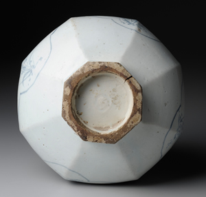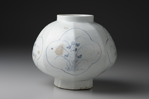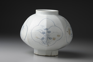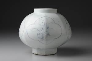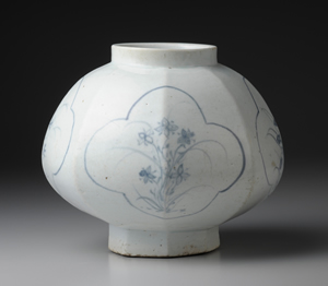 此器之成形方式乃以工具直接於圓罐器壁上進行刮削,使器身與圈足成為八面形式。器腹下垂豐滿,圈足造形端正有力等,在在吸引觀者目光。不若以尺規度量而後切削的均勻規整,本作的八個稜面顯得作風自然,從壺內側所見器壁,厚度並不均整,甚至有薄如紙面、幾可透光之處。白瓷釉色乳白溫潤,器身四面所繪紋樣清雅秀美,為「秋草手(akikusade)」中的一流名作,產自京畿道廣州市金沙里窯址。已知尚有一件作品此作相似。