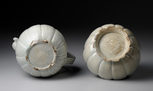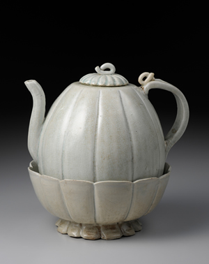 高麗白瓷與青瓷一樣,始燒於西元10世紀左右,生產中心位於京畿道一帶。至12世紀時,全羅南道的康津郡與全羅北道的扶安郡柳川里窯也加入生產行列,開始燒製高級白瓷。特別受到高麗人青睞的瓜形水注,作品數量不少,然而像本作一樣造型飽滿、瓜稜明晰的作品,實屬罕見。溫碗稜紋深刻,做工精良。據《宣和奉使高麗圖經》記載,高麗人所備之茶具中,有一類附蓋與器台的湯壺。依據宋代習慣,會在湯碗中注入熱水,用以溫熱茶水酒飲,本作即為模仿此風習之作。