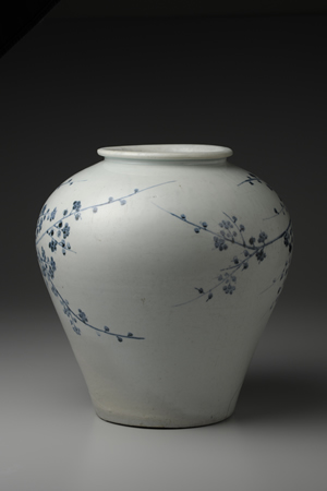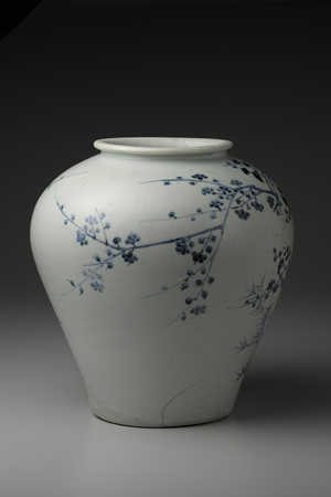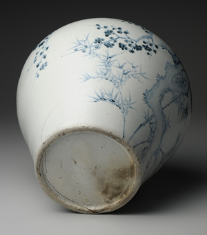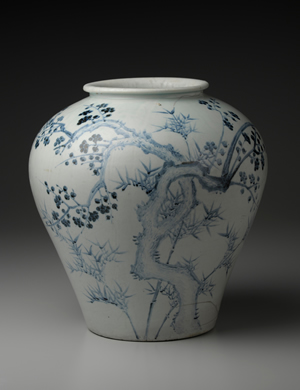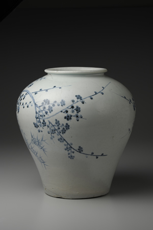 關於朝鮮王朝的青花起源,尚有諸多未能究竟之處,然而大約在1450年代初期之前,青花應已開始生產。此罐口沿成卷唇形式,肩部豐滿,為15至16世紀的典型大罐。器身中央描繪枝幹交錯的梅樹,並以濃烈鈷料裝點梅花花瓣;梅樹後面,則以淡雅青料勾勒竹子細瘦之枝葉。15至16世紀,像此作一樣作風優雅清新、彷彿滿溢香氣的朝鮮青花,就在宮廷畫師的筆尖驅動下漸次發展。