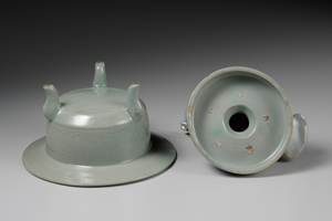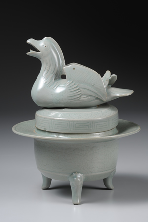 香爐,爐蓋作鴛鴦造型。以動物形象作為蓋飾的香爐,尚有龍、獅子和麒麟等幾種造型。根據《宣和奉使高麗圖經》所載:「狻猊出香」,即以獅子為飾之香爐,乃其中最精緻絕倫之作。此器爐身所焚之香,其煙氣透過鴛鴦的身體上傳,再由嘴喙處冉冉升起。香爐的造型和釉色俱優,為高麗青瓷全盛時期之作。全羅南道康津郡沙堂里窯址曾發現同類型的陶片。此外,作為消費地遺跡的忠清南道保寧市保寧元山島,以及日本福岡市箱崎遺跡,亦曾出土鴛鴦蓋香爐的破片。
