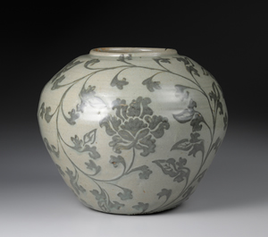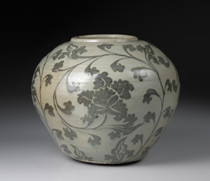 本罐器型於高麗青瓷中並不多見。器口寬敞、口沿低矮、器腹鼓張,與大氣的纏枝寶相花紋紋飾,搭配協調,相當程度表現了鐵繪青瓷自由不羈的風格趣味。鐵繪青瓷的燒造中心為全羅南道海南郡珍山里窯,除此之外,全羅南道的康津郡沙堂里窯址與扶安郡柳川里等亦有出土,本作的生產地點仍未能確定。