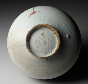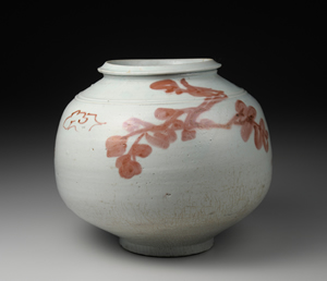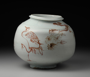 於素胎上以氧化銅描繪紋樣後,施罩透明釉入窯燒製,即為辰砂。本器造型為辰砂器的代表器型之一。口沿作獨特斗笠形式,器肩裝飾兩道突線紋。器身中央,描畫一隻面朝側面單腳站立的鶴,以及松樹之垂枝。另一面則以粗筆沒骨畫法繪樹木低垂之枝幹。本作辰砂發色極佳,滿溢素樸之魅力。以辰砂描繪獨腳鶴立之姿的作品甚是珍稀,近年於京畿道廣州市松亭洞窯址曾發現以鐵砂描繪之例。