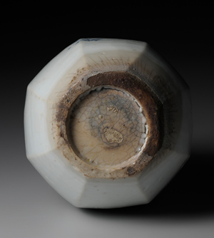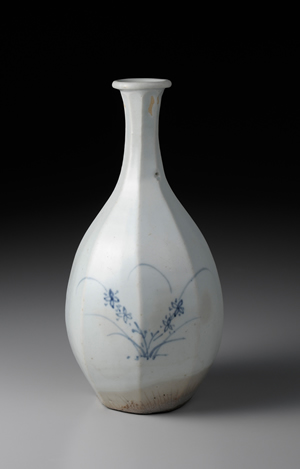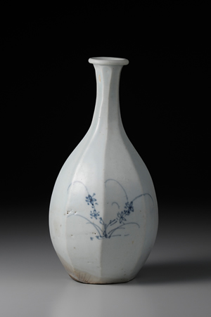 此作器身瘦削,重量適中,如此大小的青花八稜瓶,甚是珍稀。器底內挖為圈足,器口作卷唇狀。成形方式乃以篦狀工具直接於圓瓶之厚壁、由器口往下進行刮削,以此做出八面瓶身。紋樣所繪之野花,清新動人,在日本一般稱之為「秋草手(akikusade)」。簡略的紋樣,雖有一說是為減省鈷料用量之故,然此風格,毋寧更能反映當時愛好雅趣與詩意的文人美感。此瓶夙負盛名,被認為是京畿道廣州市金沙里窯址之作。