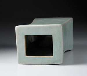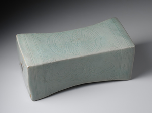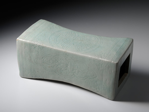 器中央略為收束的長方形枕。枕面以陽刻技法,刻繪圖案化的雙鶴紋樣。作為高麗王室的官方行館-惠陰院的遺跡中,曾出土若干此類型之青瓷枕,應是當時的高級日用品。只是,原來的枕在傳入日本之後,被削去單面的四個側角,開孔後作為花瓶使用。韓國新安所發現之沈船(1323年),原自中國出發,在駛往日本的途中沈沒,船中亦發現高麗青瓷長方形枕,據此可以確認當時器物流通的狀況。