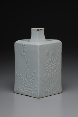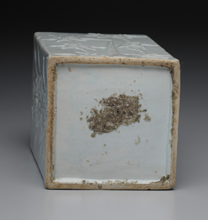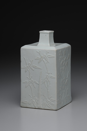 方形器身以壓製成板狀的胎土接合而成。器面分別裝飾牡丹、竹、菊、梅四種紋樣。所利用的裝飾技法,在日本稱為「いっちん(ichin)」,乃是一種以管狀工具推擠出泥條繪製紋樣的方式。之後,再進一步以銳利工具雕刻紋樣細部,賦予全器端正之面貌。器肩削去銳角成爲斜面,整體造型俐落鮮明。雅潔素樸的作風,散發濃郁文人氣息。爲京畿道廣州市分院里的作品。