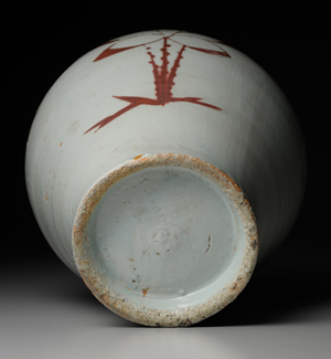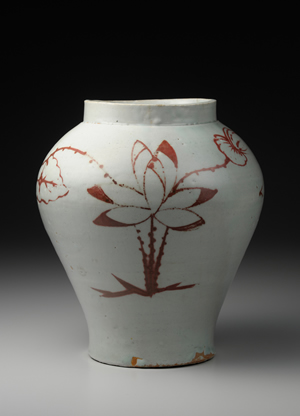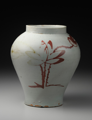 本器作廣口、短直頸,器腰略為收束,至器足處微向外撇,器型端正,具備18世紀前半典型長罐之特徵。器身中央以氧化銅描繪蓮花,花瓣尖端處,為加強立體感而加粗暈染。朝鮮王朝的辰砂彩繪發端於高麗青瓷之辰砂,然其起始時間仍不明確。據目前所存17世紀後半,帶「崇禎甲子(1684)」 銘文之辰砂墓誌推斷,此時期應已開始生產辰砂製品。18世紀,像本作一樣施飾簡略牡丹紋與蓮花紋的例子不少,然生產窯址仍然不明。