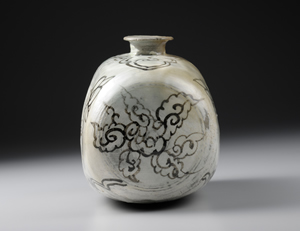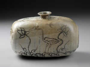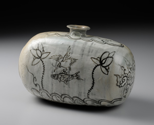 器身形似米袋、小口短頸,器型源自朝鮮半島三國時代的陶器,為盛裝酒、水之容器。器底或像此器一樣為平底形式,或附長方形圈足。然其本來之器底位在俵壺側面,以之為底,垂直而立入窯燒成。此壺器型規整,釉色優美,色調泛青,紋樣描繪秀逸超群,在雞龍山的俵壺製品中,未有能與之相比者。器身兩面分別描繪了蓮池、翠鳥、游魚圖以及蓮花、鷺鳥圖,用筆精確,甚或帶些禪畫的意境與趣味。