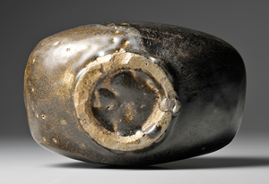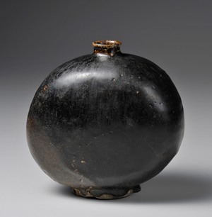 此件扁壺,先以轆轤拉出渾圓的器型,再拍扣兩側,使器身扁平。尺寸較一般扁壺為小,器口小而收束,但仍呈現強烈的存在感。兩次施掛厚重黑釉,燒成後釉色烏黑黝亮。高麗時期黑釉已然出現,但直至朝鮮時代才變得流行。15至16世紀,生產粉青器的窯場中,黑釉器與粉青器一起出土的例子並不少見,然而,似乎也存在單獨生產黑釉器的窯場。