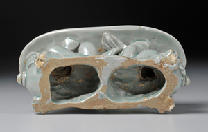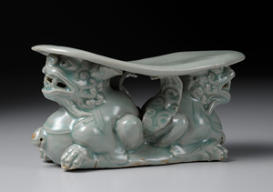 青瓷枕造型作兩隻獅子背向蹲踞,頭頂承載橢圓形薄板。獅子皆齜牙咧嘴,胸前繫鈴。台座與細節表現雖稍顯簡略,然器身各處因積釉所形成之灰青綠釉色,極為優美,堪稱翡色青瓷鼎盛時期之佳作。此器雖有一說作隨葬品之用,然亦極有可能為實用器具。底部至獅子身軀部分,呈中空形式。
