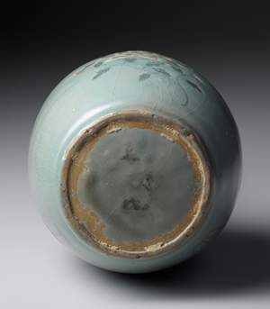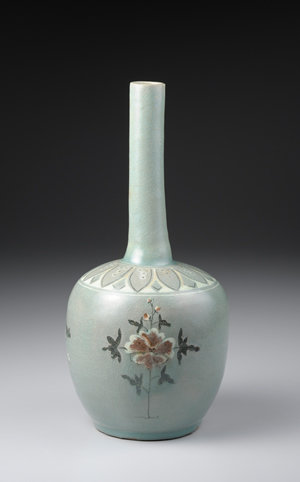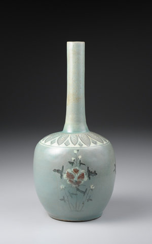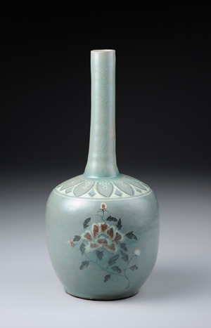 「辰砂彩」乃以氧化銅為顏料,施繪於釉下再經還原焰燒製後,呈現鮮豔之紅色發色。此瓶頸部,細長且直,肩部裝飾白黑象嵌的蓮瓣紋飾。器身計3處裝飾白象嵌的牡丹花紋,花上巧妙地以辰砂施加點綴,增添視覺效果。青瓷辰砂製品,於中國並未生產,應是高麗自行發展生成的裝飾技法。柳川里窯址曾經出土與本作一樣於白象嵌上施點辰砂彩繪之陶片。