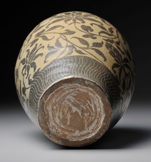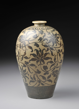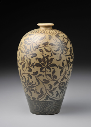 以黑褐發色的氧化鐵為顏料描繪紋樣之青瓷,稱為「青瓷鐵繪」。本器器身所繪寶相花紋,細膩精緻,風格端整秀麗,為鐵繪青瓷作品中的少見之作。瓶身底部紋樣帶的原型,有一說可溯自中國磁州窯,但仍未有定論。10世紀末的初期窯址中雖已發現青瓷鐵繪作品,然須至12世紀,以全羅南道海南郡珍山里窯為中心的窯場,才開始真正的生產燒製。因同為全羅南道的康津郡沙堂里窯址也曾出土鐵繪青瓷作品,此作確切的生產地點仍未確定。全羅南道莞島魚頭里海底的沈船中,曾出水青瓷鐵繪的梅瓶與長鼓,從中亦可窺見當時流通的真實樣貌。