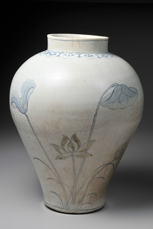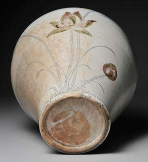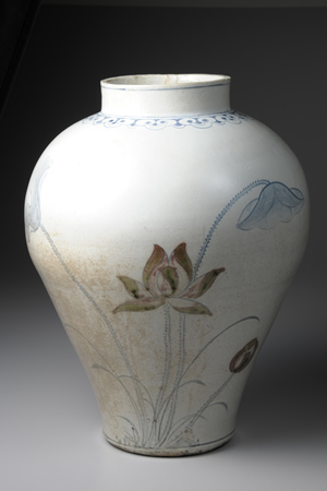 18世紀的廣州官窯中,青花紋飾搭配辰砂(銅紅)與鐵砂彩繪的作品,甚是稀少。本作尤為其中最卓爾特出者,曾經淺川伯教收藏而馳名。紋樣輪廓以青花細筆勾勒,荷葉青料發色淡雅,蓮花與花蕾以辰砂(銅紅)點綴。出眾的紋樣加之辰砂因窯變多處轉綠,在在賦予此器深層的趣味與氣韻。蓮花是特別受到喜愛的繪畫主題,經常用以裝飾文人身邊的文房用具與器物。此器被認為是京畿道廣州市分院里窯之作。